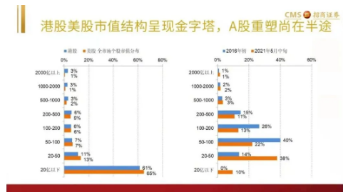 招商券商分析發現,美股市值200億美元以上的公司數量占比9%,市值20億美元以下的公司占比為65%,港股也是類似分佈。成熟資本市場中,公司市值結構整體呈金字塔型。