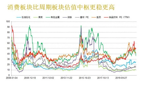 2008年至今,從行業指數的表現來看,成長較快且不受經濟週期影響的醫藥、消費行業的估值中樞逐步抬升,目前在40-50倍。相比鋼鐵、石化等週期性行業表現更佳。