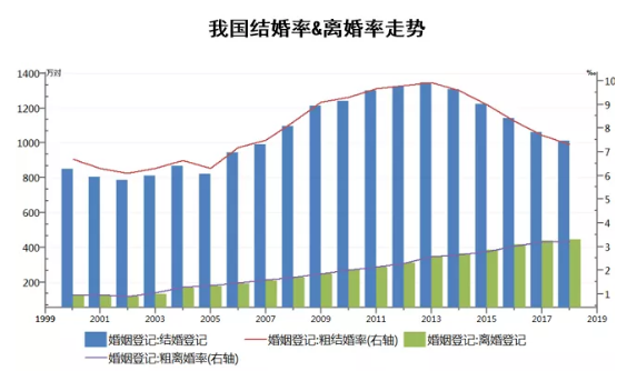 數據顯示,近些年我國結婚率不斷下降,離婚率卻日益上升(見下圖),再加上很多人婚戀觀念轉變、人際圈子小、工作繁忙等現實因素的掣肘,我國單身人士的規模已經非常龐大。根據民政部的統計,我國單身成年人口多達2.4億,這一數字甚至比俄羅斯和英國的總人口數之和還要多。不少市場機構預測,我國未來單身人口將達到4億。