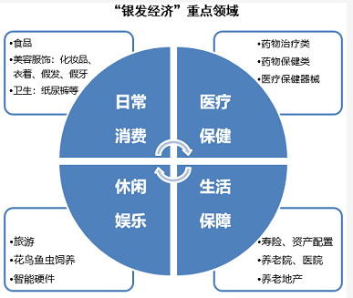 經濟社會的不斷發展,使得不同年齡層次的老年人在衣、食、住、行、遊、購、醫、娛等方面,對於消費產品和服務品質都有了更高的要求,這便形成了一個規模龐大、結構多元、豐富多彩的“銀髮經濟”市場,其中仍有很多機會亟待挖掘(見下圖)。接下來,各類養老產品與服務有望迎來快速增長期。